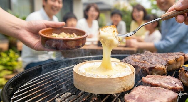 カマンベールチーズの上部を丸く切り取り、アルミホイルで包んで網の上に乗せるだけ。グツグツしてきたら、焼いたバゲットやブロッコリーをディップして楽しみます。「外でチーズフォンデュができる」という特別感に、場がパッと華やぎます。